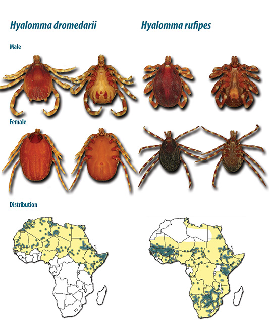 The IxodidaeHyalomma spp.Hyalomma dromedarii – the camel tickAdult H. dromedarii are large yellow-brown to nearly black ticks with long mouthparts. The legs are paler than the scutum and may be ringed by paler bands. The lateral grooves are short and deep and limited to the posterior third of the conscutum, the postero-median groove is deep and narrow, extending from a distinct parma to midlength of the conscutum. This groove is bounded on either side by converging ridges and lateral to these ridges are the deep and wide postero-lateral grooves. The sub-anal plates on the male are distinctly laterally placed in relation to the adanal plates and may extend beyond the posterior margin of the body in engorged specimens. The genital aperture of the female is narrowly elongate and triangular. The preferred hosts are camels (Camelus dromedarius), but cattle, sheep, goats and horses may also be infested. The larvae and the nymphs feed on small burrowing animals and on hares, but the nymphs may also infest camels, cattle and horses. Adults attach on the inner thighs, udder and scrotum and in the outer nostrils of camels. It is present in the arid regions of north Africa from Mauritania in the west to Egypt in the east; it is also present in Sudan, Ethiopia, Somalia and Kenya in North East Africa. It was introduced into Namibia on camels and continues to exist there on these animals in arid regions. It transmits Theileria annulata the cause of tropical theileriosis, is also a mechanical vector of camel pox and has been incriminated in a case of tick paralysis in children in Egypt.