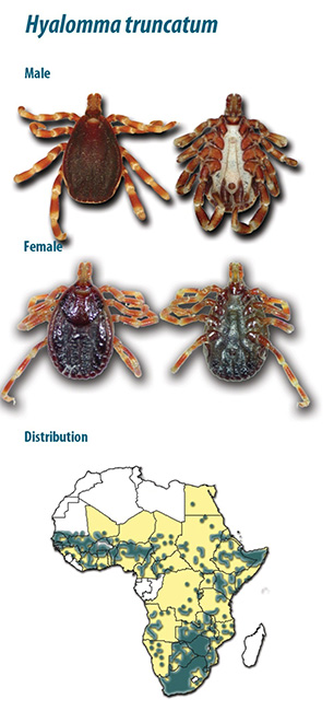 With the exception of Lesotho, the eastern Cape Province, the eastern half of the Free State, south-eastern Gauteng and south-eastern Mpumalanga and southern KwaZulu-Natal, H. truncatum is present throughout South Africa. It is present throughout Zimbabwe and much of Mozambique. It occurs in south-eastern and north-western Botswana, central and northern Namibia, and southern Angola. In Tanzania and in Kenya it is present mainly in the south-west, and with the exception of the eastern and western regions it occurs throughout Ethiopia and from there to the West African coast. Hyalomma truncatum adults feed on cattle, sheep, goats, horses, large wild herbivores and particularly on giraffes and eland and occasionally on dogs. The immature stages feed on scrub hares and on various species of small rodents (e.g.bushveld gerbils (Gerbilliscus leucogaster), and four-striped mice (Rhabdomys pumilio)). On cattle the adults of H. truncatum attach in the tail switch, around the anus, on the lower perineum and on the legs. They are also found around the hooves of sheep. The immature stages attach on the necks of scrub hares. Hyalomma truncatum is a two-host tick. The adults are “hunters”. The females feed for 7 to 14 days and then detach and lay 2 000 to 10 000 eggs and die. The larvae hatch in 30 to 60 days and infest hares or rodents, on which they engorge and moult to nymphs. The engorged nymphs detach, drop to the ground and moult to adults. The life cycle takes 1 year to complete. Certain strains of H. truncatum contain a toxin in their saliva that causes sweating sickness, an acute dermatitis in cattle, particularly calves. When the ticks infest dogs they tend to cluster at one site and can cause severe skin necrosis. The long mouthparts cause tissue damage in cattle and sheep and secondary bacterial infections may lead to abscess formation. The tick also causes lameness in lambs. Injuries caused by the long mouthparts are attractive to the blowfly Chrysomya bezziana. Ticks of the genus Hyalomma can transmit Congo Haemorrhagic fever virus to humans, and H. truncatum can transmit R. conori to humans. Hyalomma albiparmatumAll stages of this East African tick are identical in appearance to H. truncatum with the exception of an ivory-coloured central festoon in the male of H. albiparmatum.